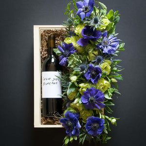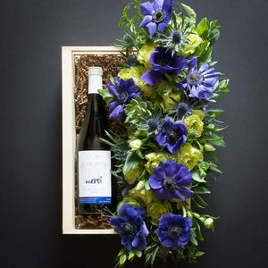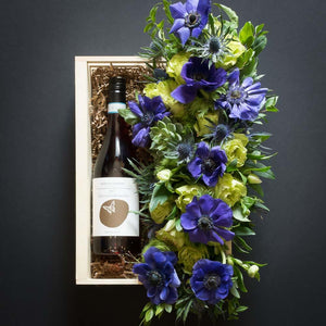 Another big name in the house, Azure is a unique strong piece, that looks so great next to our new white organic muscadet Merci organic white wine. Designed with vibrant blue anemones and green roses, with a touch of echeveria succulents and thistles, this arrangement is a great option for guys as well.
