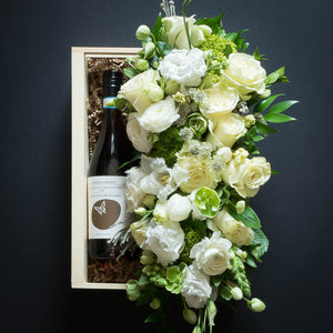 Our Jadis design needs no introduction - with over eighty 5 star product reviews, it is the most loved, elegant and versatile floral in our arsenal. Designed with lovely ranunculus, tulips, lisianthus, helleborus and other tiny little textures, this wine box, and its lovely organic wine, is a gift to impress.