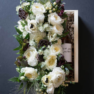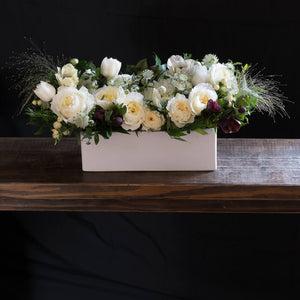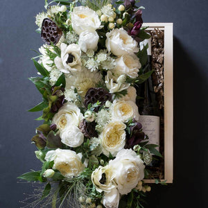 Box size: 15’’L x 9"W. Floral arrangement: 17"L X 6"W approx.
