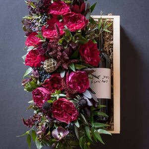 Box size: 15’’L x 9"W. Floral arrangement: 17"L X 6"W approx.