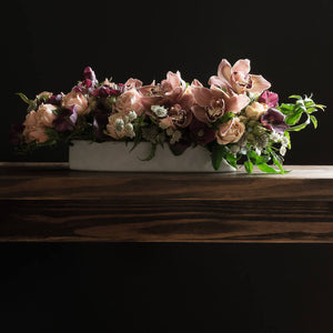 An alluring mix of hues, Sahara , is a successful color pairing with an unexpected twist. Lush bedding of blooming jasmine, red “helles”, and flying astranties, set the stage to lovely peachy spray roses and the fabulous mauve cymbidium orchid.