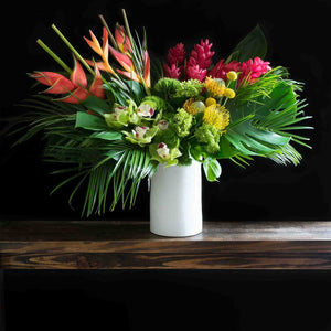 When you live in paradise, tropical flowers are all around us; with that in mind, we decide to create Tropics - a floral that is exuberant in colors and shapes. Designed with seasonal leaves such as mosteras, aralias, robelines, which house birds of paradise, gingers, pincushion, green tricks  and the star of the show, cymbidium orchids.