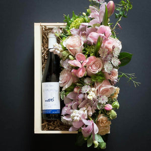 The perfect marriage - beautiful flowers and excellent organic wine. Surprise and delight someone special with this unique gift. Flower piece is designed on a delicate ceramic vase to be enjoyed as a side table floral arrangement. Designed with lovely tulips, scabiosas, hyacinths, roses and the super star - blush cymbidium orchids (lot’s of them. :)